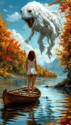 Что может быть прекраснее осени на природе в лесу. На картине представлена женщина, которая плывет на лодке по осеннему озеру. Неожиданно девушка встретила гигантское белое сопливое существо из больного подсознания. И совсем необязательно, что именно подсознание главной героини родило этого монстра в небе.
